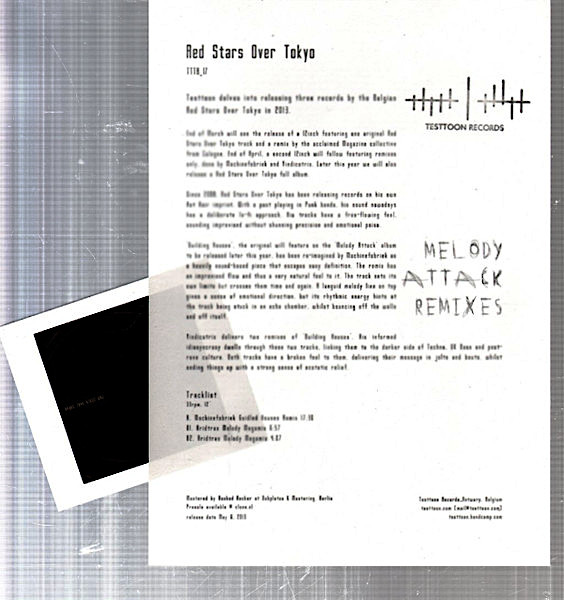 The Melody Attack Remixes 12″ contains ‘Building Houses’, the original will feature on the ‘Melody Attack’ album to be released later this year, has been re-imagined by Machinefabriek as a heavily sound-based piece that escapes easy definition. The remix has an improvised flow and thus a very natural feel to it. The track sets its own limits but crosses them time and again. A languid melody line on top gives a sense of emotional direction, but its rhythmic energy hints at the track being stuck in an echo chamber, whilst bouncing off the walls and off itself.