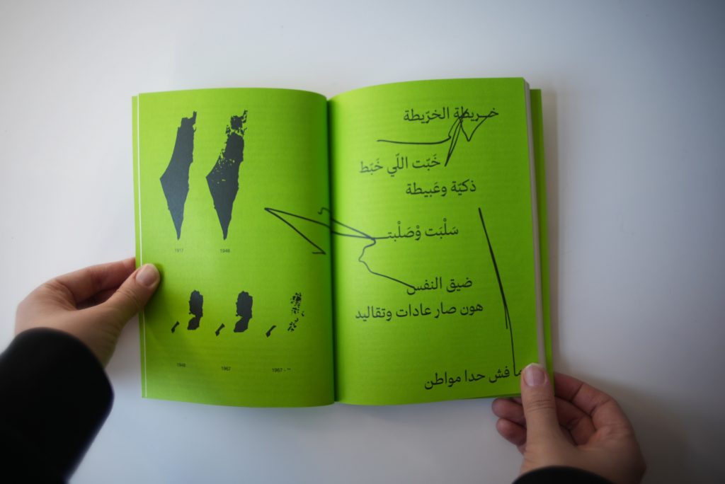 Alia Al-Sabi and Amany Khalifa take apart Palestinian ‘return’ through a conversation that unfolds across literary, temporal, and spacial registers. Amr Amer and Laura al-Tibi weave together song and critical analysis, unsettling colonial conceptions of Palestinians’ relation to their land economically and existentially. Basel Abbas and Ruanne Abou-Rahme offer a comprehensive hypothesis of the “negative,” unfolding across poetry, images, and illustration. Adam HajYahia and Haitham Haddad formulate an aesthetic theory of revolt, examined through text, images, and illustration. By focusing on the interplay between text and artistic form, “To all those we are indebted to” proposes new methods of thinking and creating, aesthetically and politically.