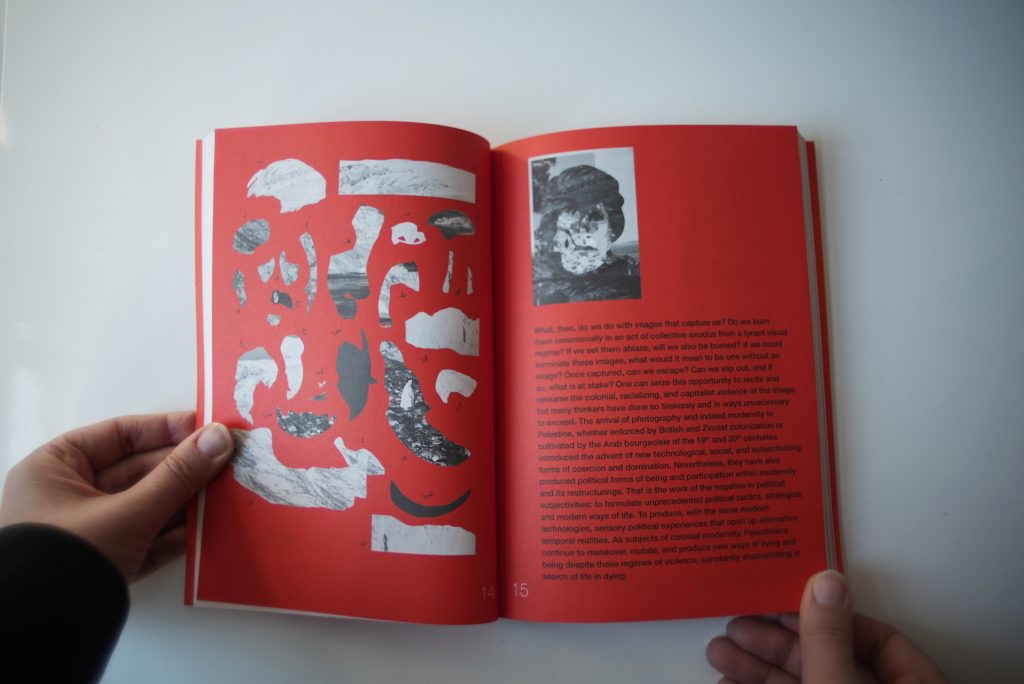 Alia Al-Sabi and Amany Khalifa take apart Palestinian ‘return’ through a conversation that unfolds across literary, temporal, and spacial registers. Amr Amer and Laura al-Tibi weave together song and critical analysis, unsettling colonial conceptions of Palestinians’ relation to their land economically and existentially. Basel Abbas and Ruanne Abou-Rahme offer a comprehensive hypothesis of the “negative,” unfolding across poetry, images, and illustration. Adam HajYahia and Haitham Haddad formulate an aesthetic theory of revolt, examined through text, images, and illustration. By focusing on the interplay between text and artistic form, “To all those we are indebted to” proposes new methods of thinking and creating, aesthetically and politically.