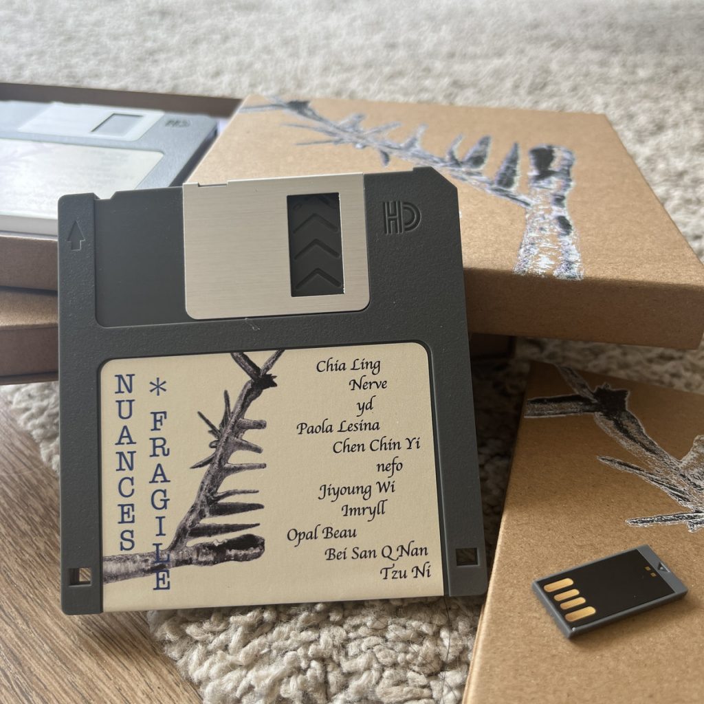 Tzu Ni impressed me recently with her amazing electronic music performance. A Taiwanese artist currently based in the Netherlands, she explores the entangled relationship between sound, gender, and space, often through multichannel sonic installations, field recordings, and text‑based narratives that emerge from subconscious memory. And this really curious publication caught my eye and ear! It is a compilation album on a flash drive, 16 GB USB, smartly hidden in what looks like a floppy disk. No floppy in here, sorry!! But the drive includes a sound sample pack file, the album and an interactive PDF with hyperlinks to each artist.